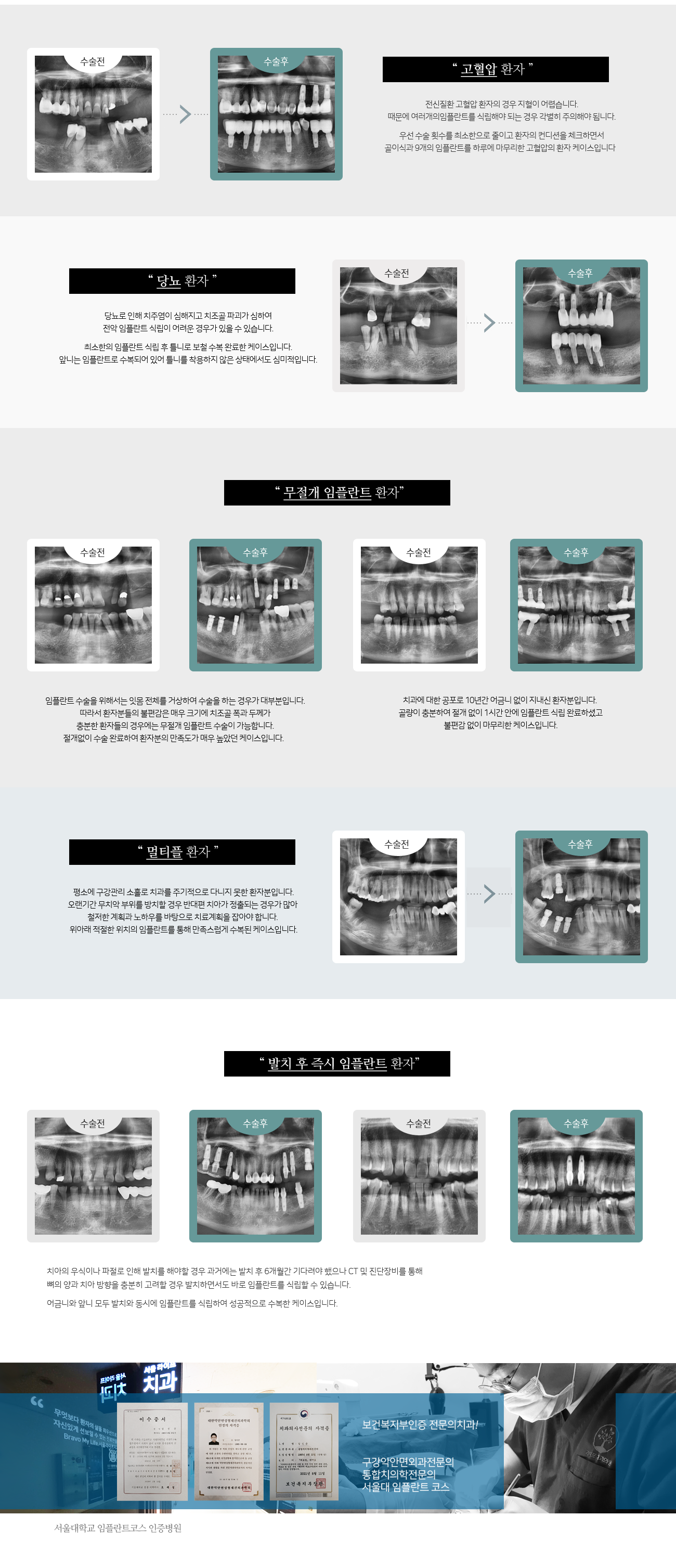 다양한 케이스별 임플란트 치료 사례 임플란트는 자연 치아의 기능을 대신 해주는 인공 치아로, 한번 심은 임플란트가 오랫동안 치아의 기능을 제대로 하기 위해서는 단순히 심어주는 것이 아닌 순서에 따라 체계적인 과정으로 치료가 이루어져야 합니다 SEOUL LIFE DENTAL CLINIC